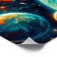 Um astronauta solitário flutua no espaço contra o nítido pano de fundo da Terra e numerosos corpos celestes. Cores vibrantes e detalhes intrincados capturam a vastidão e mistério do universo.