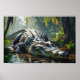 A large crocodile rests in a lush, tropical environment, partially submerged in a shallow water body surrounded by vibrant green foliage. Sunlight filters through the trees, casting dappled light on the reptile's scaly skin.