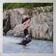Jovem se apressando em uma costa rochosa.