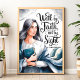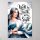 Um retrato aquoso de uma mulher segurando uma Bíblia com um fundo suave de nuvens e as palavras "Caminhar pela Fé, Não Pela Visão" no estilo moderno elegante e ousado caligrafia.
