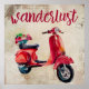 Poster bonitinho com uma pintura branca de um ciclomotor vermelho com uma cesta de flores atrás. O ciclomotor tem um design retrovisor de tendência. Pronto para a aventura. Wanderlust escrito em uma fonte manuscrita de rico. Tipografia inspiracional. O fundo é uma textura vítrea em relevo crítico com círculos e marcas aleatórias de cor castanho claro.