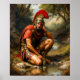 A Roman soldier with a red plume helmet and armor is kneeling by a tranquil stream in a lush, wooded landscape. He appears deep in thought, perhaps contemplating his journey or past battles. The light filters through the trees, highlighting the natural beauty and solitude of the setting.