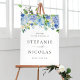 Bem-vindos convidados para o seu casamento com este personalizável sinal de boas-vindas. Apresenta uma várzea floral de hidrocores azuis, roxas e brancas e rosas com acentos verdes. Personalize este sinal azul de boas-vindas ao casamento floral adicionando seus detalhes. Esta placa de casamento da hydrangea é perfeita para primavera e casamentos no inverno.