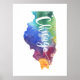 Esta design apresenta um mapa do Estado de Illinois dos EUA apresentando a cidade de Chicago com uma textura de aquarela pintada com várias cores. O texto estilizado de "Chicago" é adicionado por cima com uma estrela para indicar a localização da cidade.