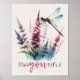 Uplift your walls with this stunning watercolor art print. Featuring a delicate dragonfly perched on vibrant purple and pink wildflowers, this design showcases the inspiring "Beyoutiful" quote—a gentle reminder to always be your authentic self.