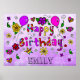 Flores roxas bonito, corações, estrelas Sinais de Poster Feliz Aniversário desenhado à Mão em cores brilhantes como vermelho, rosa, roxo, verde limão e amarelo. Basta adicionar o nome da aniversariante na área de personalização.