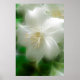Poster White Shiny Jasmine, composição inspirada em uma flor branca brilhante de jasmim. Seu estame amarelo é corajosamente visível e suas folhas verdes. Esta adorável jasmim branca está completamente florescida e olha ao mesmo tempo, simples e luxuosa. A imagem de origem é editada com efeito de manipulação especial que cria algum tipo de brilho e as mostra nas pétalas de flores dando-lhes o brilho que têm sob a luz do sol.