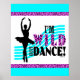Poster para dançarinos apresentando uma bailarina de bailarina posando em um tutu e o texto, "Sou Selvagem sobre DANÇA!". A palavra "Selvagem" tem um padrão de impressão de guepardas. ©gollygirls.com