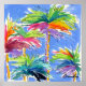 Uma ilustração colorida de palmeiras multicoloridas contra um céu azul