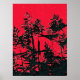 Um design de abstrato de arte de flores silvestres pretas silenciado contra um céu vermelho.