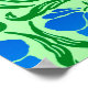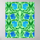Impressão numa vintage, William Morris, um padrão têxtil estilizado de flores e folhas de pântano estilizadas - flores num gradiente de azul-cerulano profundo a claro, com folhas verdes esmeraldas, sobre fundo verde limão claro