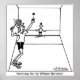 Um jogador de raquete prestes a acertar uma maçã na cabeça de um menino com uma bola dizendo, "E agora pelo meu tiro William tell."