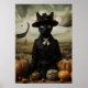 This whimsical Halloween artwork features a stylish black cat dressed as a Victorian witch, surrounded by a quirky array of jack-o'-lanterns under a surreal autumn sky. A perfect blend of spooky and charming, this fantasy print is ideal for Halloween lovers, gothic decor fans, and anyone who enjoys magical realism with a feline twist.
