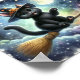 Esta impressão de aquarela branca apresenta um feliz pequeno gato de bruxa numa viagem de vassoura.
