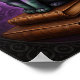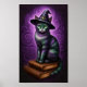 Esta poster com um barulho apresenta um gato com uma mesa com uma bruxa sentada sobre dois livros empilhados entre um pano de fundo roxo vibrante.