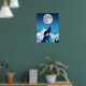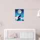 Poster em uma silhueta negra de um lobo, uivando em uma grande lua de cheio, parado em um pico de montanha com gelo coberto de montanhas ao fundo