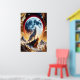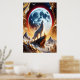 Um lobo branco fica em um pico rochoso, uivando em uma lua azul grande com um halo vermelho. A cena é colocada contra um pano de fundo de montanhas nevadas e uma floresta distante.