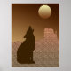 Poster em uma colagem mestiça de um lobo uivando na lua no cenário do deserto, em padrões de castanho e bege