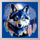 Lindo Lobo com olhos amarelos profundos, com Sonhadores Nativos Americanos, numa Paisagem Azul Selvagem e Lua Cheia. Design do logotipo original redondo vetor isolado em branco Copyright BluedarkArt The ChameleonArt.