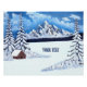 Um poster com uma bela cena de inverno, incluindo montanhas de neve, cabana rústica e neve coberta por vergreens. A imagem pode ser personalizada. Você também tem a opção de adicionar texto. Arte original por W.B.