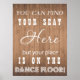 "Você pode encontrar seu assento aqui, mas seu lugar está na pista de dança", um cartaz engraçado para a recepção de casamento. O fundo de madeira é excelente para casamentos de campo, rústicos e celeiros, mas você pode encontrar o mesmo sinal em preto e branco em nosso compro!