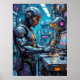 Esta pintura retrata uma ciborgue fêmea operando uma workstation complexa em um cenário futurista. Seu corpo e capacete são uma mistura de cinzentos metálicos e brancos, acentuados com luzes laranja brilhantes. O fundo é uma densa e intrincada teia de máquinas e monitores, todos reproduzidos com uma grossa e texturizada falha no estilo. A paleta dinâmica e laranja cria uma atmosfera tecnologicamente avançada.