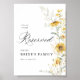 Coordinate with matching sunflower wedding stationery including invitations, RSVP cards, programs, menus, table numbers, seating charts, guest book signs, and timeline signage for a cohesive wedding suite.