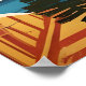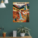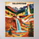 Arte de poster da Yellowstone USA, com cores ousadas, cachoeiras em cascata, montanhas e paisagens geotérmicas no estilo abstrato moderno.