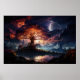 Um trabalho de arte colorido da árvore, Yggdrasil, iluminado por dentro, sentado sobre uma colina que ignora um corpo de água, no qual se reflete, e no qual se coletam pessoas. A árvore é banhada em vermelhos, laranjas, e amarelos. Atrás da árvore está ou uma cidade ou algumas formações rochosas, cobertas por neblina. O céu é cheio de nuvens vermelhas raivosas, através das quais os céus são espremidos, em azul e roxo, com uma grande lua de cinza pendurada do centro para a direita.