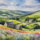 "Yorkshire Meadowsong". Paisagem Yorkshire Dales. Esta ilustração estilizada da aquarela dos Yorkshire Dales expele tranquilidade, com colinas rolantes e campos confinados por muros de pedra. As casas de pedra enfiam a paisagem, e as vibrantes flores de campo fornecem um contraste colorido, incorporando o espírito pacífico e relaxado do campo.