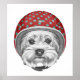 Este design apresenta um retrato de um Yorkshire Terrier vestindo um capacete pontilhado de polca vermelho e lacrado.