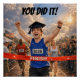 Shows graduate in mortarboard cap triumphantly crossing a metaphorical finish line.