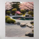 Um oásis tranquilo capturado num quadro de solteiro. Padrões de cascalho, rochas simbólicas, meticulosamente rajadas, e uma lagoa de sereno koi criam um equilíbrio harmonioso.