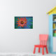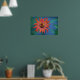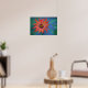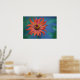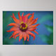 Este poster de qualidade apresenta uma zinnia vermelha orangada com um fundo azul e verde impressionante.