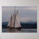 O Monte Baker aumenta à distância, à medida que o veleiro Zodiac é acenado nas águas calmas da Baía de Bellingham.