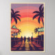 Bring retro summer vibes with this vintage beach sunset poster — boardwalk, palm trees, and warm gradient skies in stylized vintage colors. Perfect for coastal homes or vacation-themed rooms. Available in many print sizes and finishes.