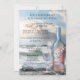 Um belo posto ou convite de festa de casamento com uma pintura original de uma garrafa de vinho com dois copos na frente da praia. Excelente para uma recepção apenas ou comemoração após o casamento. Adorável para um casamento temido com vinho ou celebração costeira.