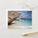 Cartão postal das grandes pedras de pedra na areia e no mar Mediterrâneo na praia de Cala Mariolu, na ilha da Sardenha, Itália, com um bar fraco e o texto: "Sardenha".