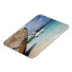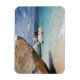 Imagem fotográfica retangular com as grandes pedras pedregosas na areia e no Mar Mediterrâneo na praia de Cala Mariolu, na ilha Sardenha, Itália.