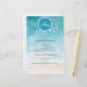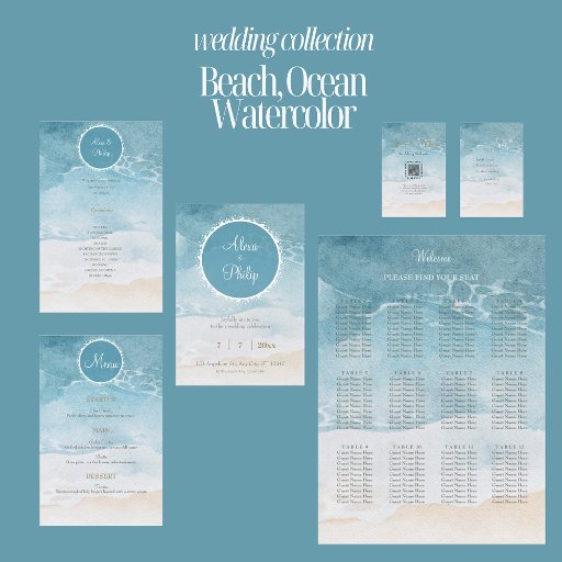 Praia, menu Casamento de Fundo de Aquarela do Oceano Este maravilhoso menu de casamento captura a beleza serena de um tema litorâneo com seu fundo de aquarela em tons de azul macio e bege, reminiscente do oceano e praias arenosas. A design apresenta um quadro circular com bordas brancas delicadas, o que dá o efeito de ondas suavemente onduladas na costa. Os nomes do casal são escritos elegantemente em uma fonte de script fluente, adicionando um toque romântico, enquanto os detalhes são exibidos em uma fonte serif limpa em um tom quente e dourado. Perfeito para um casamento na praia ou no destino, esse convite expele calma e elegância, convidando convidados a se juntar a uma celebração cheia de amor e beleza natural. F008