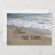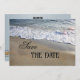 Um elegante e simples cartão Salvar a data com ondas na praia, na frente, e um design azul empoeirado, no verso. O modelo de código QR pode ser facilmente personalizado adicionando seu próprio URL de site.