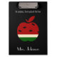 Prancheta moderna para seu professor favorito no vermelho, no preto & no branco com a maçã da "melancia" do divertimento na parte dianteira. A parte dianteira da prancheta é preto contínuo, com maçã no centro, e sala personalizar com nome do professor na parte inferior. Acima da maçã é o conselho perfeito: "seja criativo…. pense fora da caixa". Suporte da prancheta é igualmente preto dispersado com as bolinhas brancas minúsculas, com as seguintes citações: Os melhores professores ensinam do coração, não do livro.