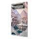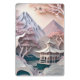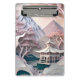 Uma adorável e falsa prancheta de recortes paisagística com montanhas, pavilhão e árvores.