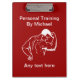 Pranchetas pessoais feitas sob encomenda do instrutor com imagem de um construtor de corpo em um lado e de um barbell no segundo lado, junto com o texto você pode personalizar em ambos os lados neste modelo inteligente simples da prancheta. Projetado para um gym do exercício, um treinamento pessoal, ou um treinador da malhação.