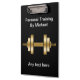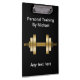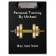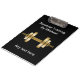 Pranchetas pessoais feitas sob encomenda do instrutor com imagem de um dumbbell e de um texto que dourados você pode personalizar em ambos os lados neste modelo inteligente simples. Projetado para um gym do exercício, um treinamento pessoal, ou um treinador da malhação.