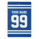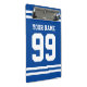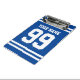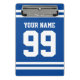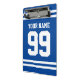 Presente de mini prancheta de número de camisa desportiva personalizada. Presente de Férias ou Aniversário personalizado para treinador desportivo, treinador pessoal, instrutor de malhação, amigo, mãe, pai, chefe, colega de trabalho, empregado, professor escolar, trabalhador de escritório, crianças, etc. Design esportivo com nome e listras. Cores azuis e brancas ou personalizadas. Impresso no dois lados. É útil para notas de fazer, mantendo pontuação e muito mais. Utilização em futebol, baseball, basquetebol, futebol, tênis, golfe, voleibol, hóquei, malhação e outros esportes de equipe.