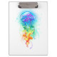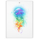 Água-viva grande, iridescente, desenhada artisticamente, brilhante, com longos tentáculos em branco, pintada sobre fundo de aquarela multicolorido. Água-viva arco-íris.