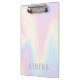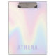Área de transferência com um fundo de padrão arco-íris pastel macio e seu nome em roxo claro.