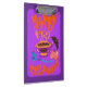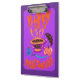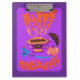 Ilustração original de uma xícara de café da bruxa amante de Gato Halloween, varinha mágica, poção, pequenos fantasmas fofos, abóbora e morcego voador com letras de mão dizendo Feliz Halloween. Em cores brilhantes modernas com ilustração divertida roxa e laranja para as crianças.