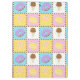 Satisfaça o seu doce dente com este padrão colorido que apresenta gostosões como um cone de sorvete de chocolate, uma rosquinha de chocolate fosco púrpura, um macarão amarelo-limão, e um pirulito rodoso, rosa e branco, separado por pedaços de chocolate e cercado por aspersão arco-íris em quatro quadrados brilhantemente abarrotados.